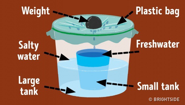 Đổ nước biển vào bình, đặt cốc giữa lòng bình, phủ bạt lên và đặt vật nặng vào giữa bát. Sau một khoảng thời gian, bạn sẽ có nước để uống.