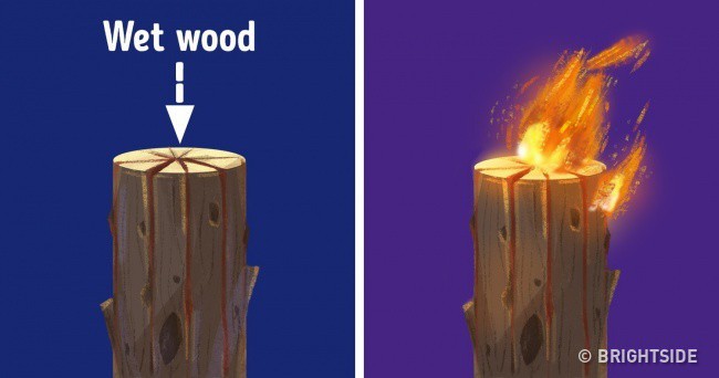 Lý do cách này có hiệu quả là vì gỗ thường chỉ ướt ở lớp bên ngoài. Việc châm lửa từ trong sẽ giúp nước bay hơi nhanh hơn, còn củi cũng dễ giữ lửa hơn.